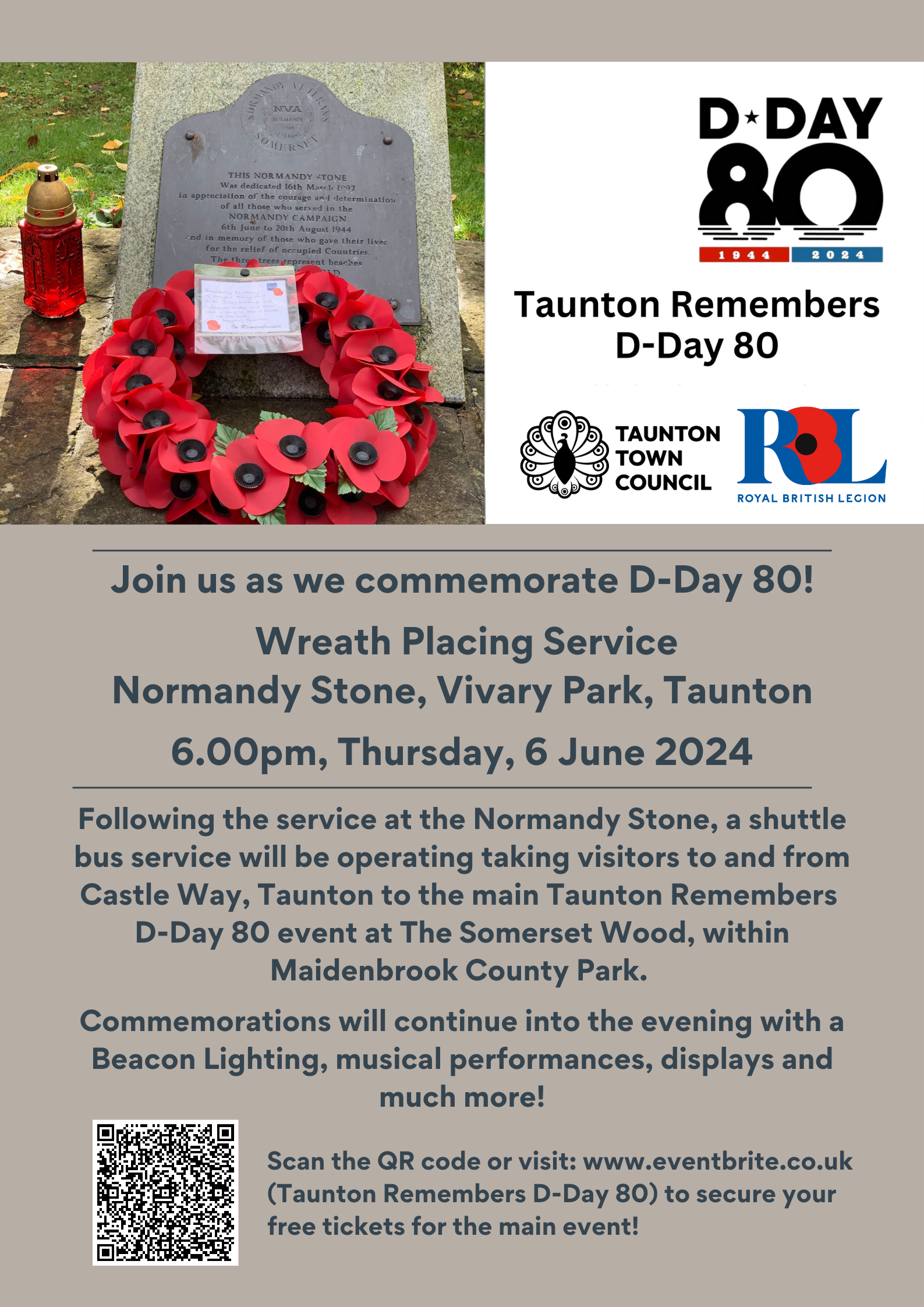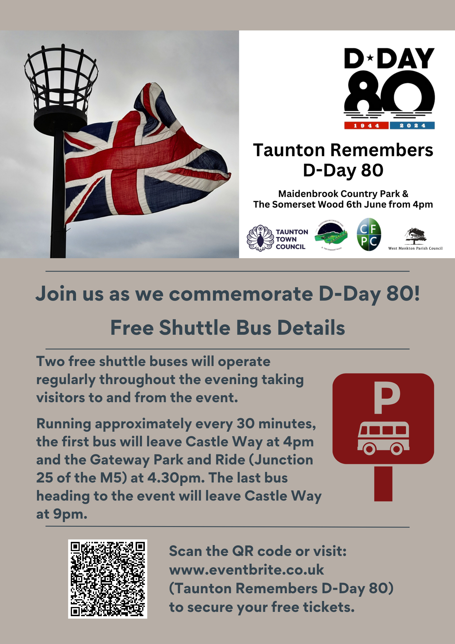 Following the service, a shuttle bus service will be operating, taking visitors to and from Castle Way to the main Taunton Remembers D-Day 80 event at the Somerset Wood, within Maidenbrook County Park. Here commemorations will continue into the evening with a beacon lighting, musical performances, display and more.